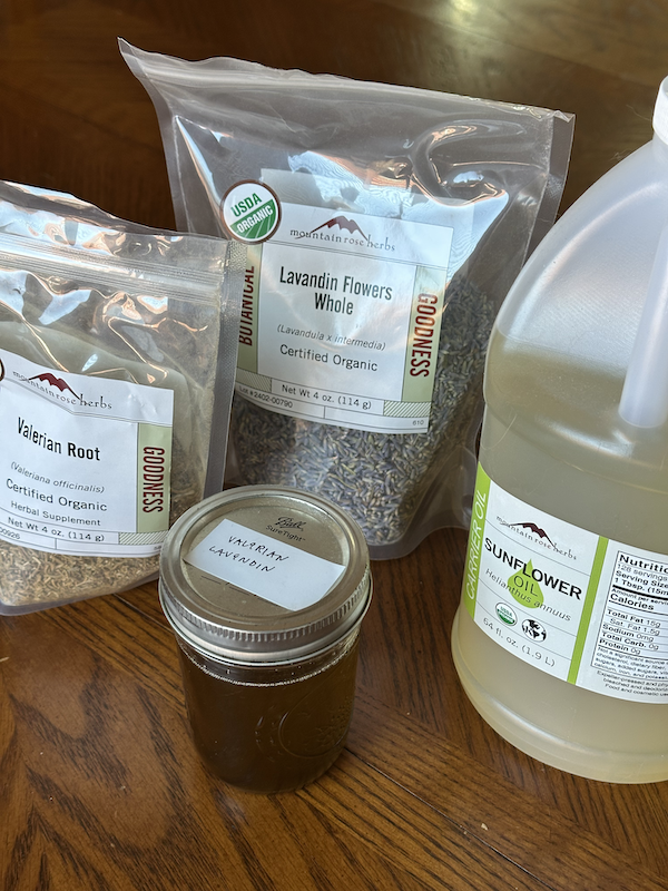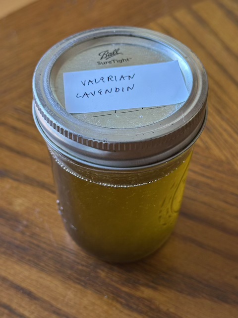 Having used Valerian in tea before to help with chronic pain, I knew that this is where I wanted to start. I added Lavendin to this oil to help aid in promoting mental clarity, ease etc. It works pretty well! I’ve also lent it to a friend to use.